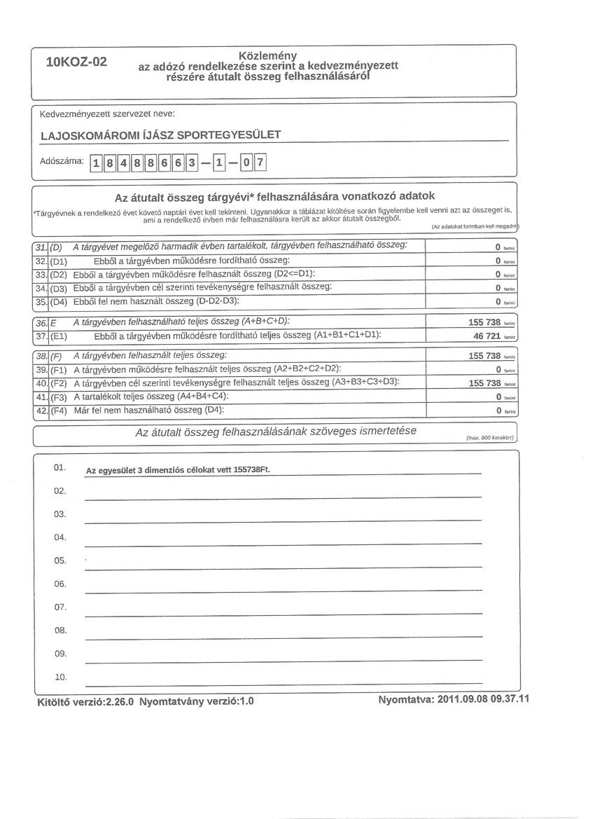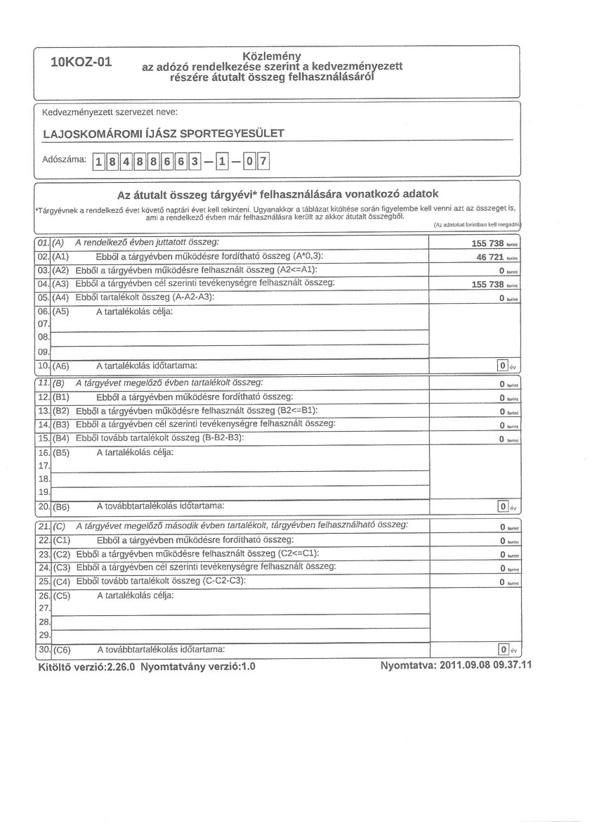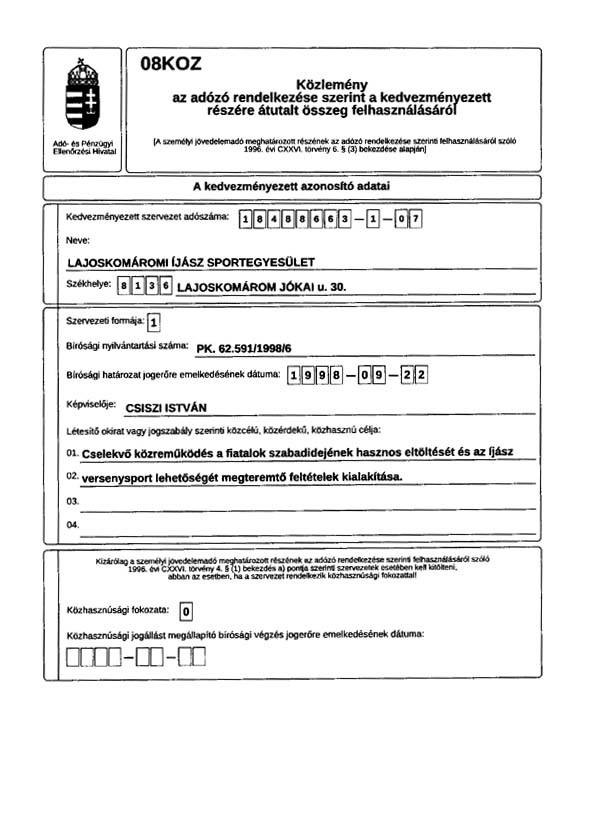 1998-ban elindítottuk a folyamatot; hivatalosan bejegyzett szervezet szeretnénk lenni. Az egyesület neve: Lajoskomáromi Íjász Sportegyesület. Pontokba szedtük az alapszabályt, és megválasztottuk a vezetőséget. Szeptemberben 22-dikétől hivatalosan bejegyzett egyesület vagyunk! Elkészült az adószámos pecsétünk, és számlaszámot is kaptunk. Évről-évre az az íjász, aki kategóriájában a legjobb, egy kupa tulajdonosa lesz egy évig. Ha ezt háromszor megismétli, az övé a kupa, és az ezzel járó cím: "az év legjobb lövője". Ezta kupát csak az egyesület tagjai nyerhetik el.